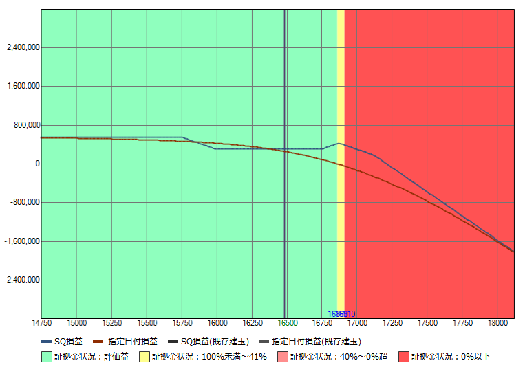 なんとなく見ていても、16000-16750の間は利益の損得があまりない感じですね。ゆっくり外側の売りをスライドさせていくだけです。