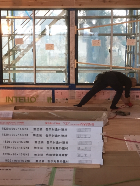 外の軒下にはクリアーの塗装をしている職人さんがいます。