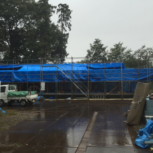 順次屋根を作っていますが、まだ完成されていないのでブルーシートで覆われています。