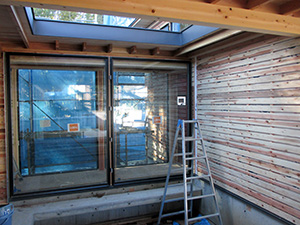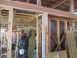 外の軒下にはクリアーの塗装をしている職人さんがいます。
