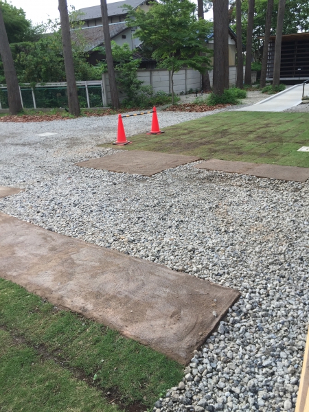 駐車場の芝生もやられてしまうので、砂利が入らないように入り口に「固まる土」で自然な感じに仕上げるようにしてみた。